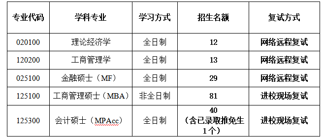 工商管理学、理论经济学、金融硕士(MF):网络远程复试,通过学信网“研招远程复试系统”进行复试,同时选用阿里钉钉作为备用复试平台。具体见下表: